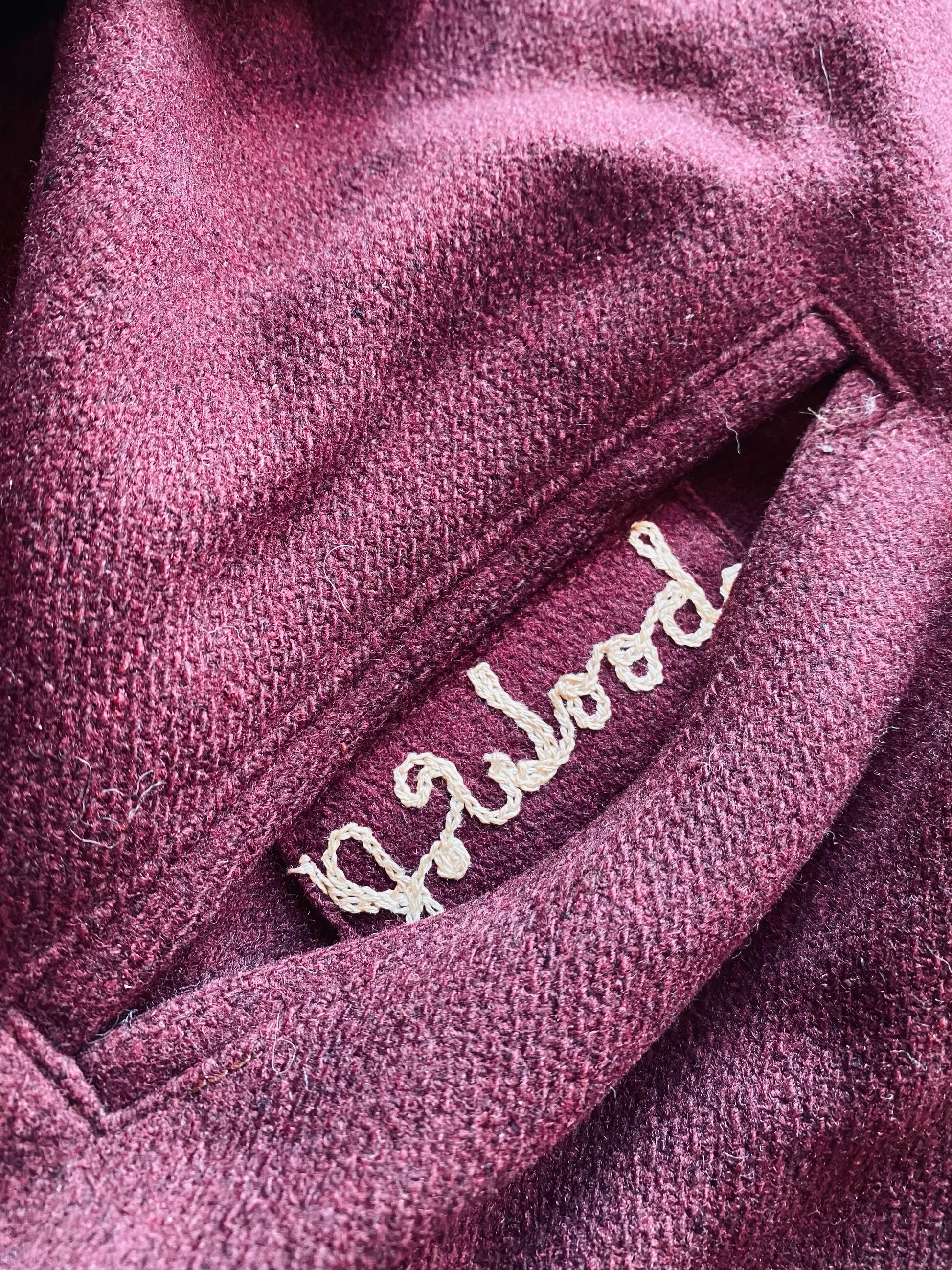 All wool, a few sleeve patches and reversible. Outside is burgundy wool, inside is a tan cotton. This jacket was originally owned by J. Wood, they were in marching band at Blackwell.