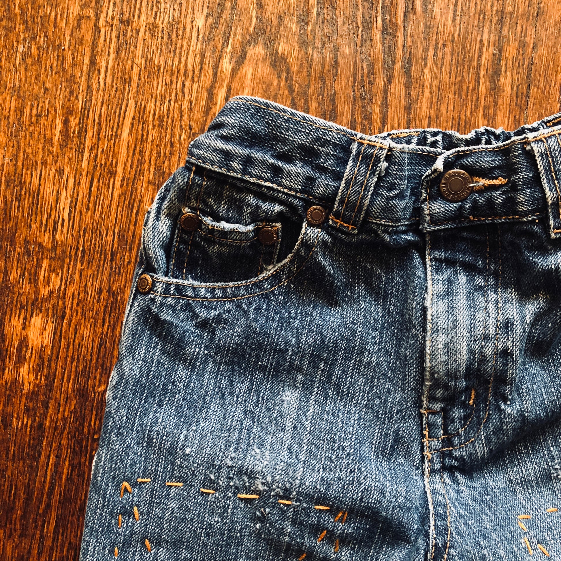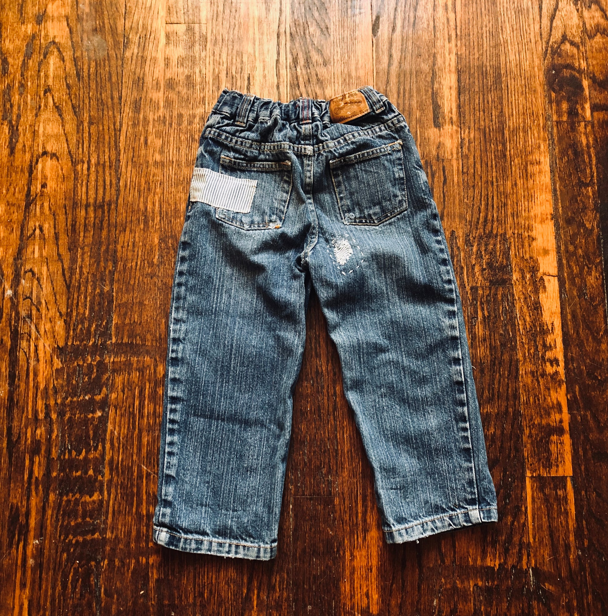 These little jeans have been well worn, mended and worn again. With the coolest reinforced knees, patchwork on the back and sick fades, these jeans will add some serious style to any kids wardrobe.